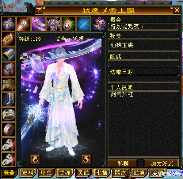 怀旧开服已经有5年之久,相比现在气武当的强势,最初气武当并没有多少人玩。而今天要给大家介绍的,就是怀旧老牌气武当大佬——弑魔雪上飘的最新装备。