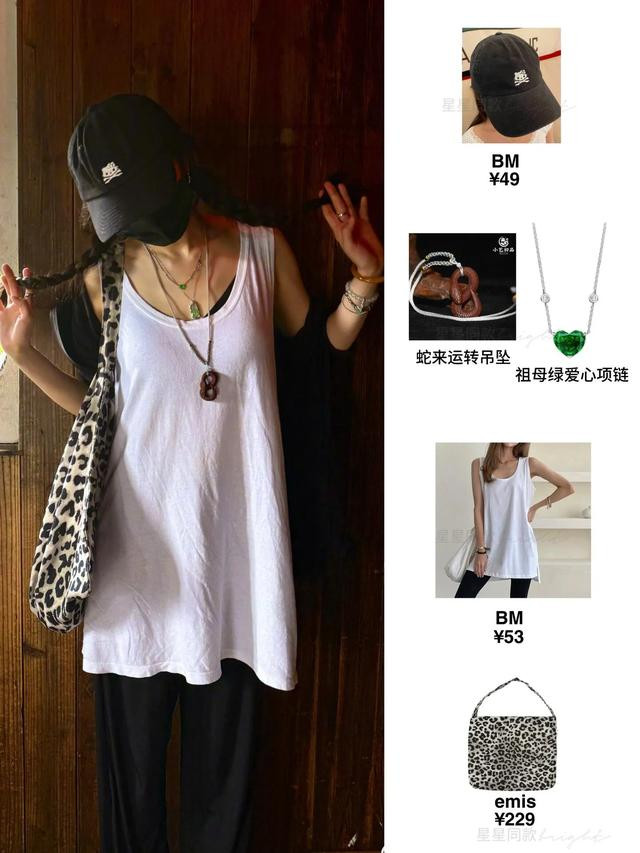 杨幂去江西景德镇游玩,她背着一款豹纹帆布包,她身上穿的BM白色长款背心才50块,整套穿搭舒服又便宜。但是杨幂戴了华丽的祖母绿项链和翡翠吊坠,她用配饰让穿搭显得很贵气。杨幂脖子上挂了一个“蛇形”吊坠,这个“蛇来运转”的寓意很好,她很会选配饰。