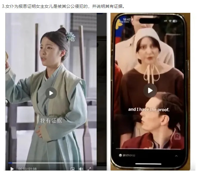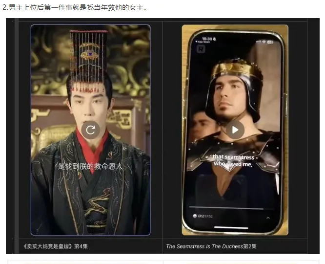 极目新闻记者注意到,听花岛方面提供对比大量截图,表示ReelShort平台上线播放的微短剧《TheSeamstresslsTheDuchess》,其人物设置、人物关系、经典剧情及情节起承转合等,均与《卖菜大妈竟是皇嫂》高度相似;ReelShort上线微短剧《MatedtoMyBrother-in-LawAlpha》,也涉嫌抄袭《冷面小叔宠嫂无度》,英文短剧的台词,也几乎是英文复刻了后者的台词。