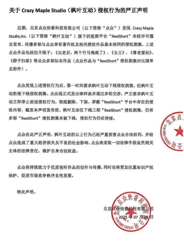 极目新闻记者关注到,7月25日,北京点众快看科技有限公司也发布了类似声明表示,自己的版权作品《出走后,两个竹马悔疯了》《女王》《尊老爱幼》等多部知名作品,也被“ReelShort”侵权。