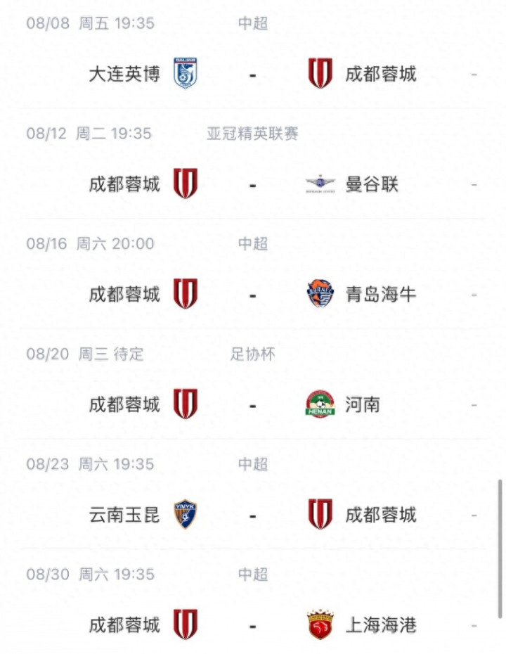根据赛程,蓉城8月还有6场比赛,分别是8月8日联赛客战大连英博、8月12日亚冠精英联赛附加赛主场对阵曼谷联、8月16日联赛主场对阵青岛海牛、足协杯主场对阵河南队(时间待定)、8月23日联赛客场对阵云南玉昆以及8月30日联赛主场对阵海港。