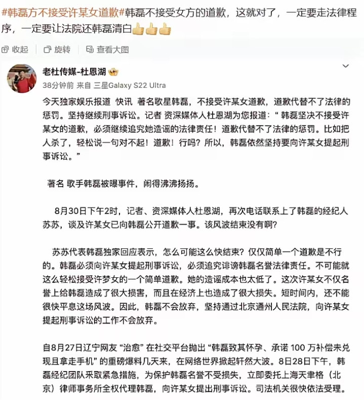 女生在网上发文,就是冲着钱来的,给钱这事就能完结。其实韩磊完全有能力拿出这笔钱,但没做过的事情,绝对不能妥协,坚决用法律维护自己权益。