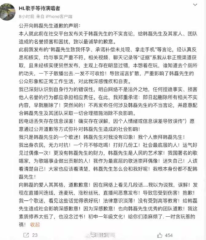 8月27日,一名女性在社交媒体发文,称韩磊让她怀孕,承诺100万补偿未兑现。