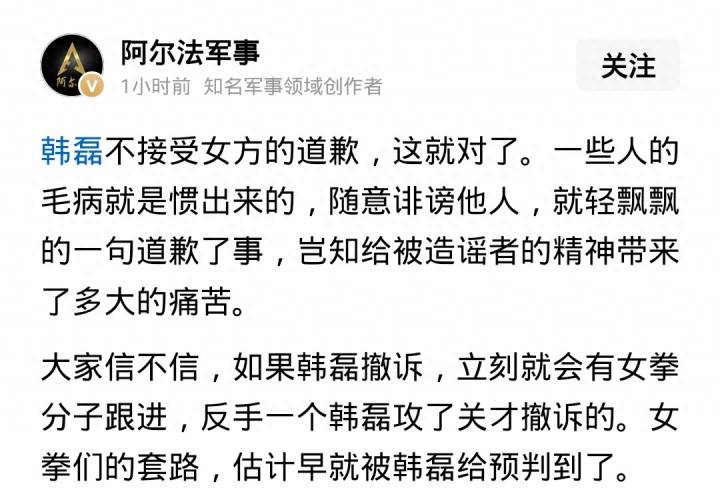 阿尔法:韩磊不接受女方道歉,随意诽谤他人,不是道歉就能完事的,女拳们的套路早就被韩磊预判了。