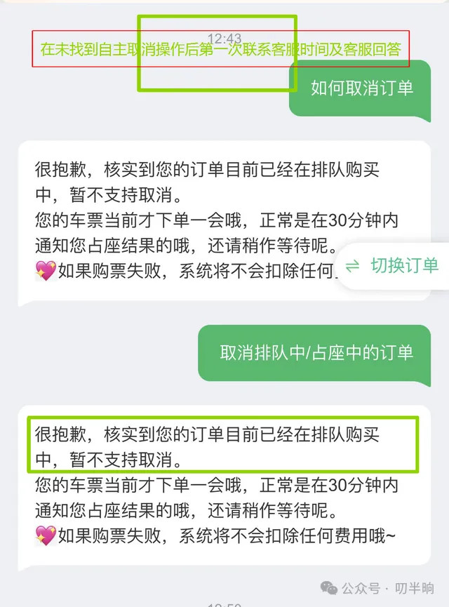 这时候我并没有放弃,直接找到那个界面的在线客服咨询“如何取消正在排队的订单”,客服回复我说不能取消……