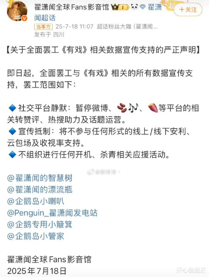 在翟潇闻还在欢欢喜喜一起宣传的时候,后援会的声明随后发出。
