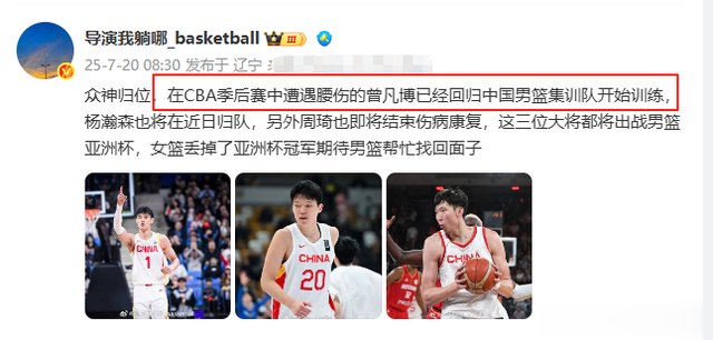 在上午的时候,我们还看到著名博主“导演我躺哪”公开表示,中国男篮的3大核心曾凡博、杨瀚森、周琦即将回归中国男篮,跟随球队一去去征战亚洲杯的好消息。没想到啊,这居然是虚晃一枪,杨瀚森和周琦能回来,曾凡博却不能了。
