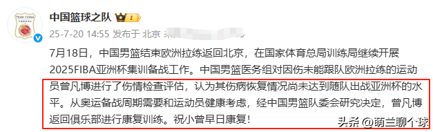 7月20日下午14:55,中国篮球之队正式官宣了事关曾凡博的消息,是这样说的:“中国男篮医务组对因伤未能跟队欧洲拉练的运动员曾凡博进行了伤情检查评估,认为其伤病恢复情况尚未达到随队出战亚洲杯的水平。从奥运备战周期需要和运动员健康考虑,经中国男篮队委会研究决定,曾凡博返回俱乐部进行康复训练。”