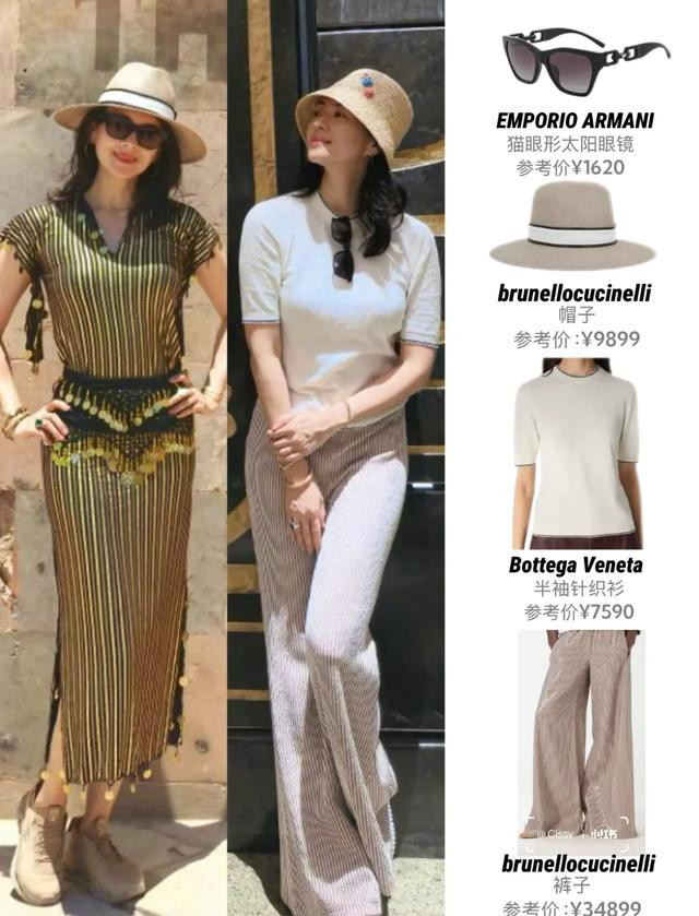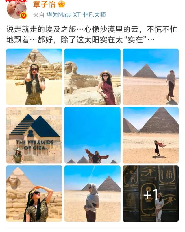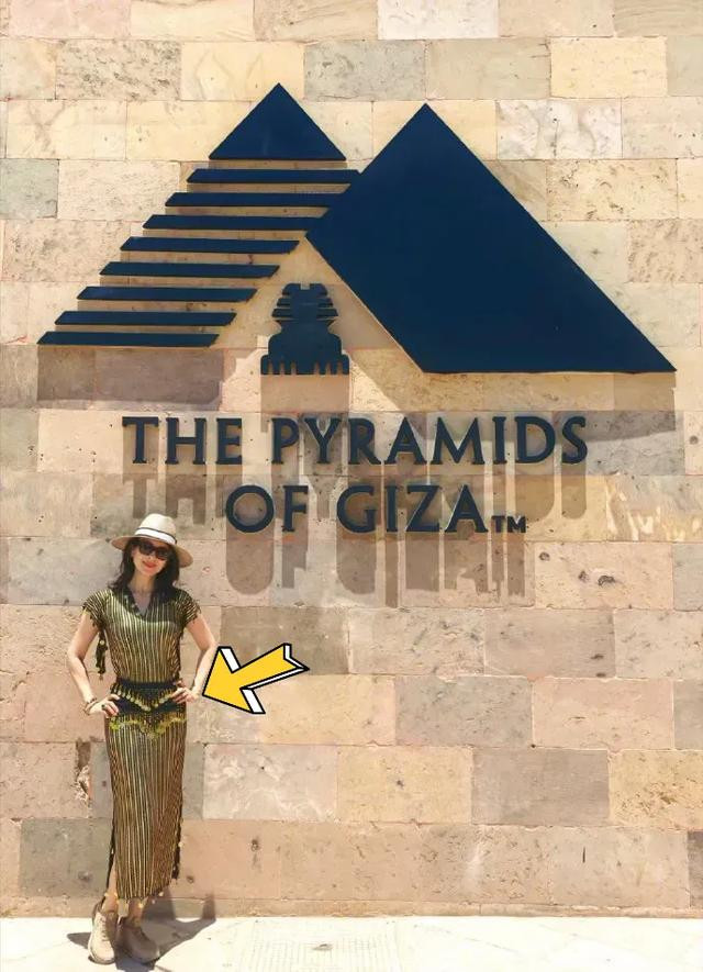 章子怡戴着草帽和墨镜,她头上戴的那条金色配饰原本是裙子的腰带,她戴在头上更有“艳后”风范,这个穿搭小巧思很惊艳。章子怡叉腰站在埃及金字塔前,她笑的很美。