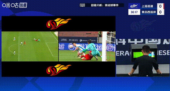 第39分钟,杨希禁区绊倒加布里埃尔,主裁判孙盛宇回看VAR后判罚点球。此后,莱昂纳多操刀主罚点球击中立柱弹回,没有其他人碰到的情况下补射打进,二次触球犯规进球无效。