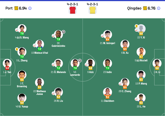 中场:21-梅伦多【72分,47-蒯纪闻】、26-刘若钒【67分,49-李新翔】、10-马特乌斯·维塔尔【89分,27-冯劲】、30-加布里埃尔【89分,6-徐新】