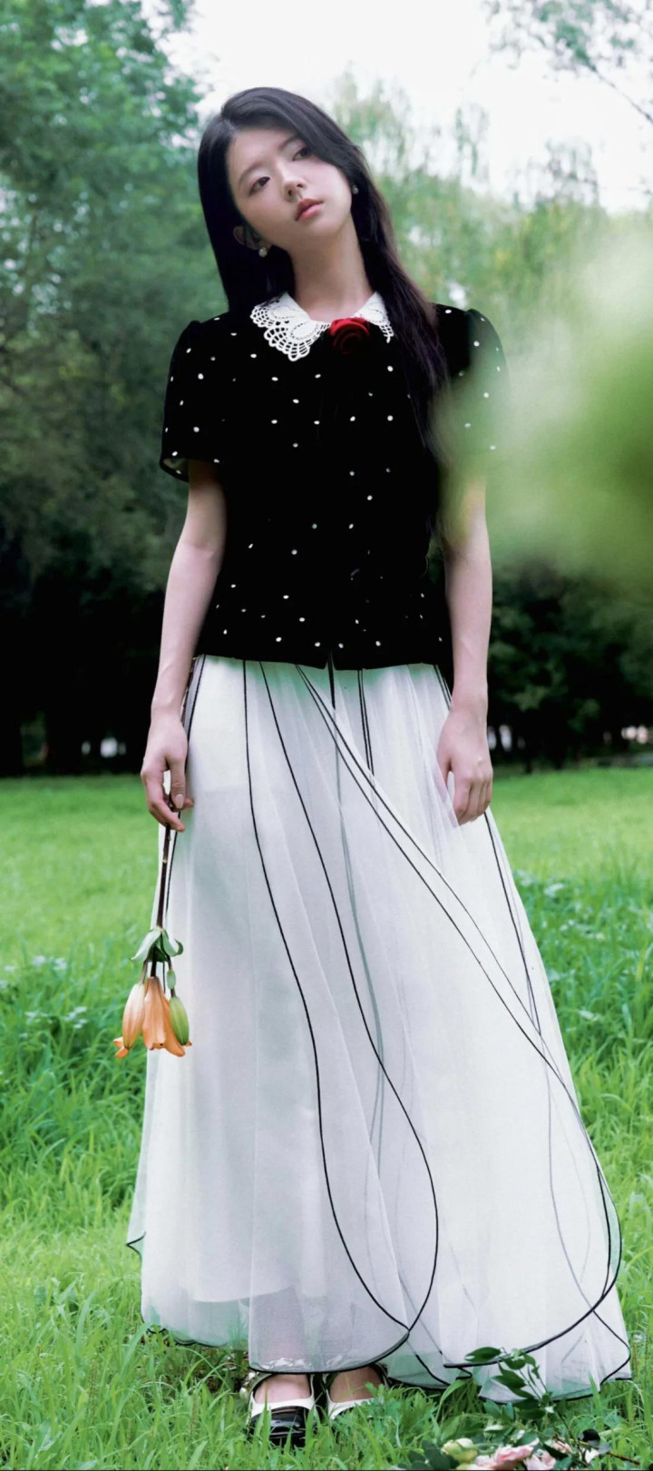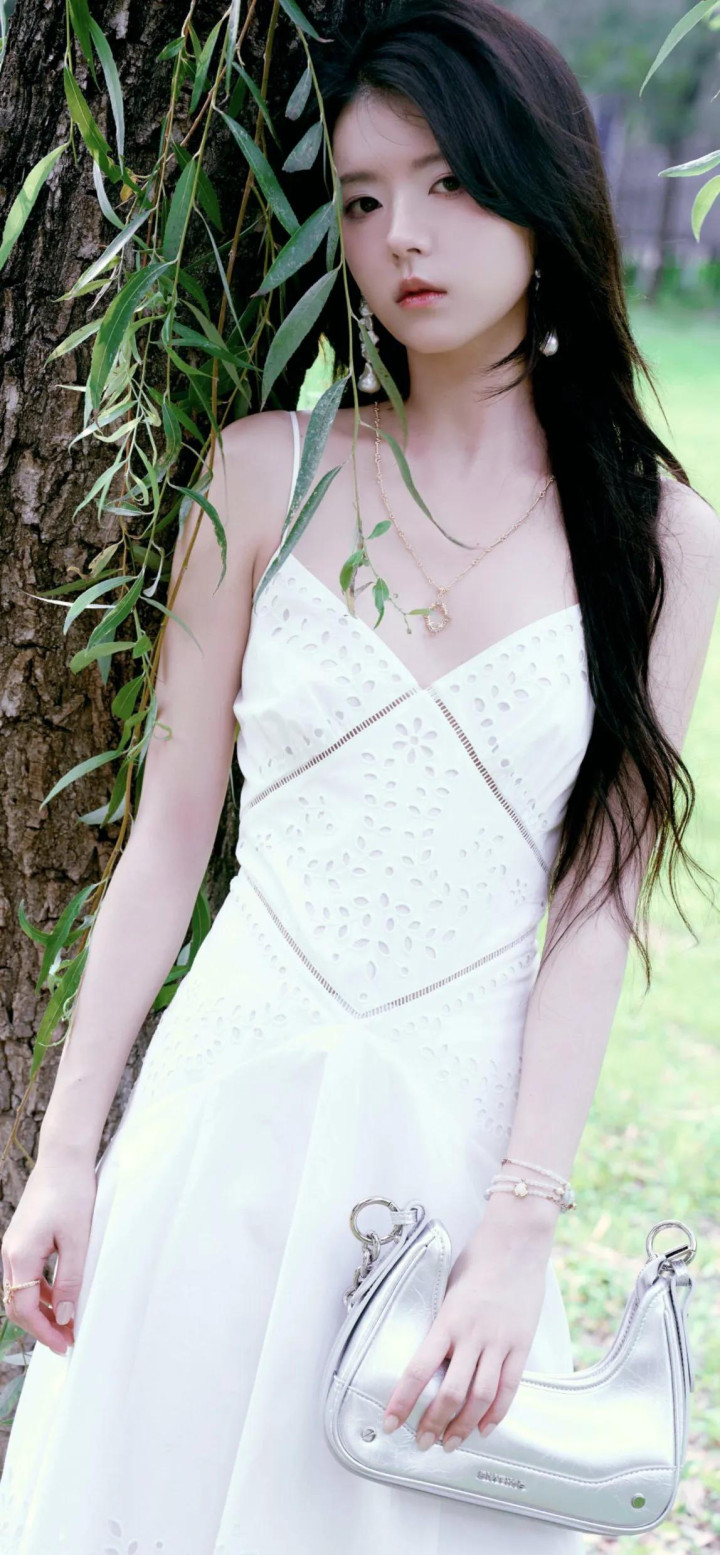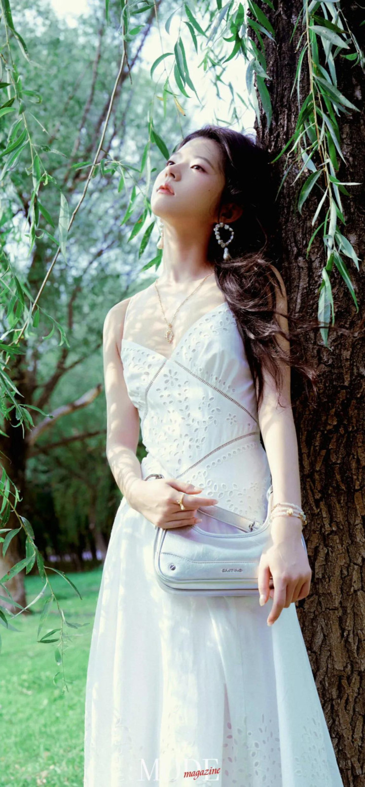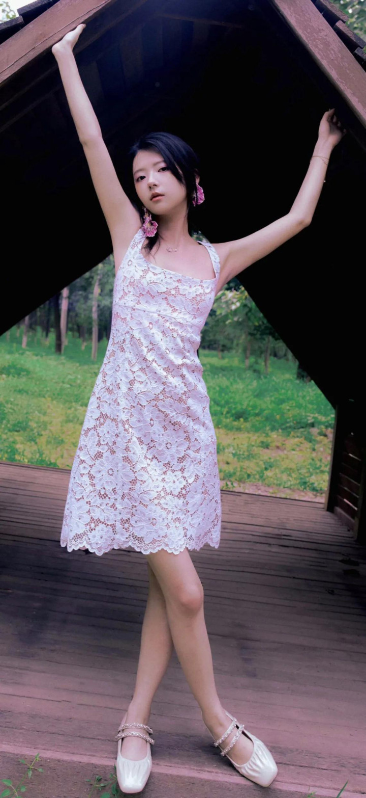 造型亮点:妆发由皮卡丽团队打造,强调清新通透感;服装含花卉印花、网纱元素(如1JINN STUDIO烫钻套装),搭配AFAI手作布艺配饰(碎花布袋、大肠圈)。