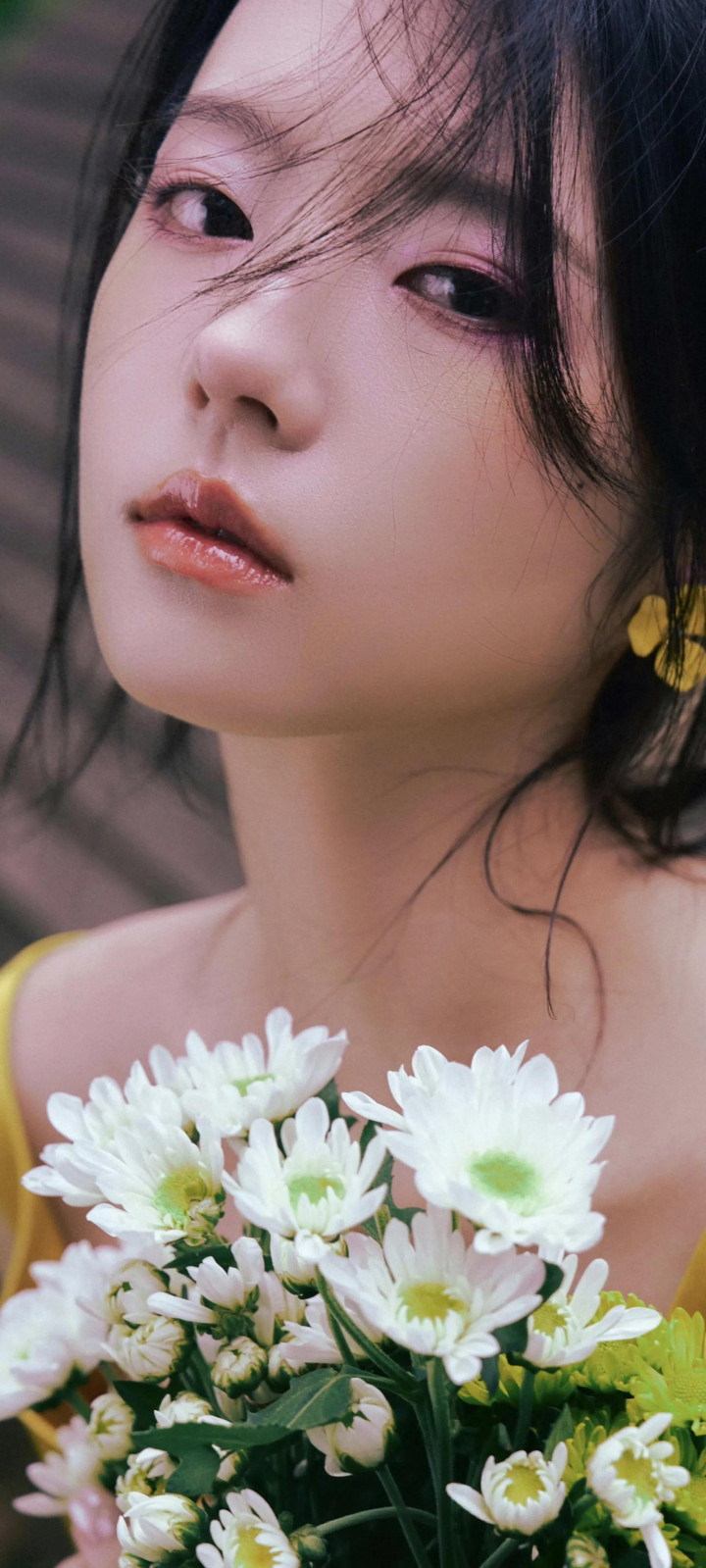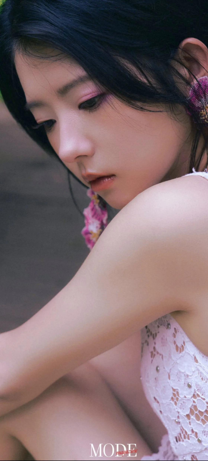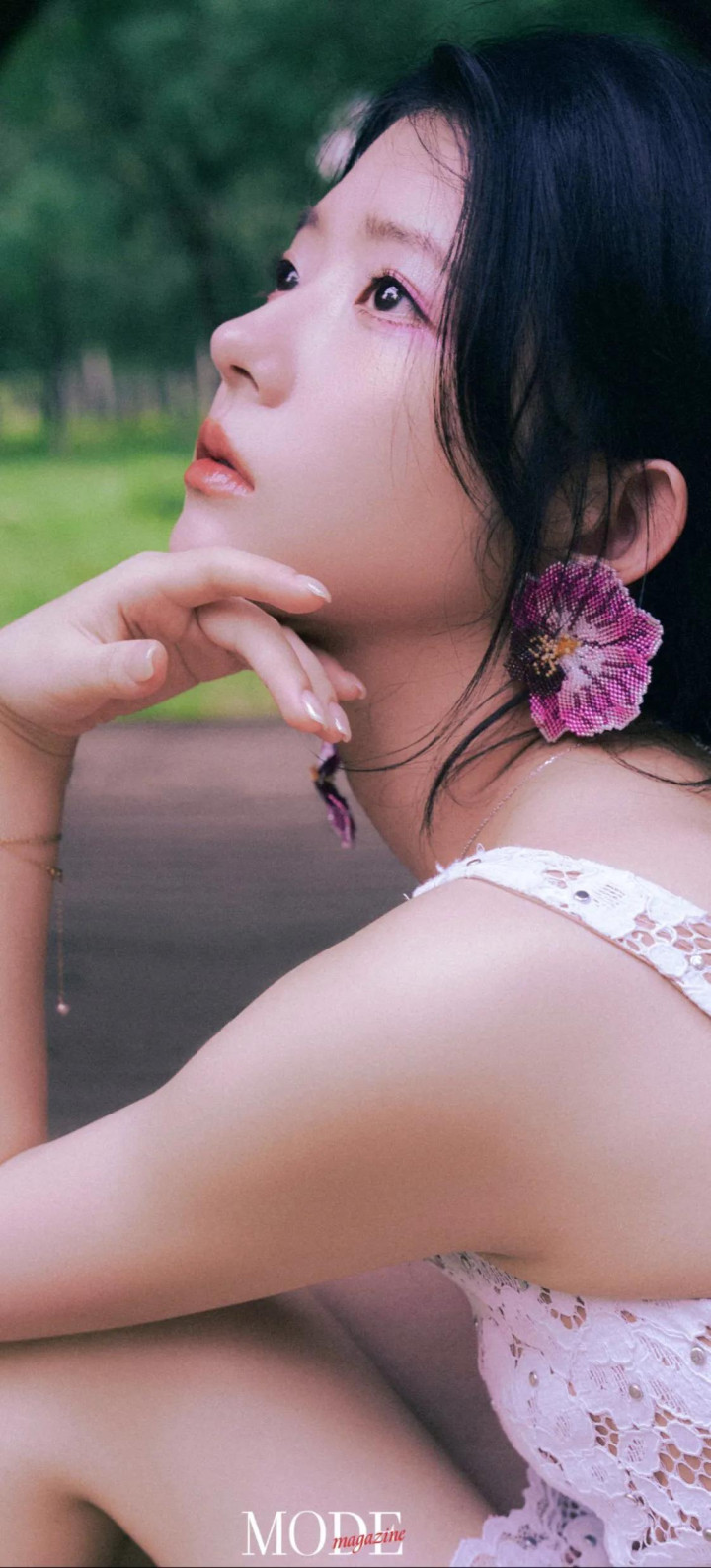 造型亮点:妆发由皮卡丽团队打造,强调清新通透感;服装含花卉印花、网纱元素(如1JINN STUDIO烫钻套装),搭配AFAI手作布艺配饰(碎花布袋、大肠圈)。