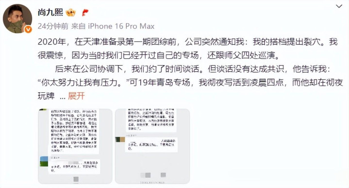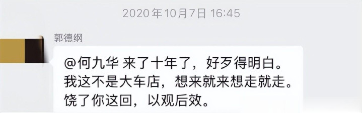 要说为什么处罚尚九熙,还要从“尚九熙回应”这件事情说起。尚九熙发长文,讲述了五年前与何九华裂穴,以及单位的应对和处理。还晒出了德云社去聊的截图,何九华的道歉,栾云平的叮嘱,郭德纲的表态。可以说,有讲述,有证据,条理清晰,有图有真相。就当大家力挺尚九熙,等德云社一个说法的时候。郭晓小直播点了尚九熙,认为他不应该晒截图。