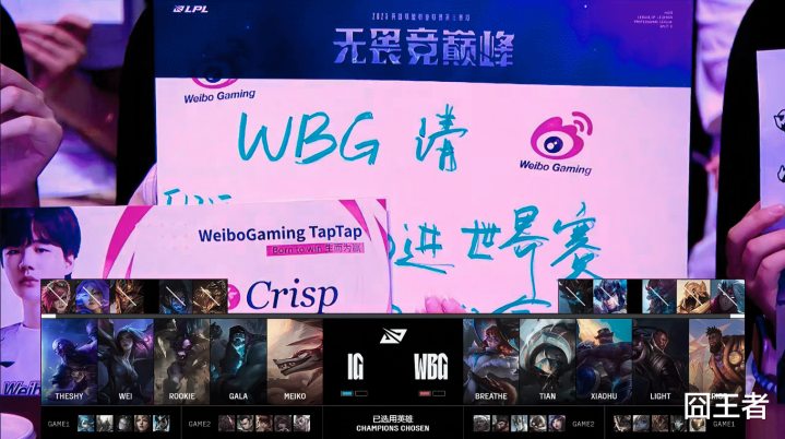 第二局比赛,WBG蓝色方,禁用:皇子、卡莎、韦鲁斯、鳄鱼、约里克,选用:Breathe安蓓萨、Tian猴子、Xiaohu加里奥、Light飞机、Crisp妮蔻;IG红色方,禁用:巨魔、沙皇、芸阿娜、滑板鞋、牛头,选用:TheShy赛恩、Wei赵信、Rookie安妮、GALA霞、Meiko洛