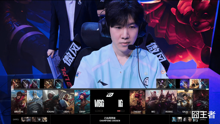 第一局比赛,WBG蓝色方,禁用:阿萝拉、安妮、韦鲁斯、牛头、卡莎,选用:Breathe兰博、Tian波比、Xiaohu岩雀、Light烬、Crisp巴德;IG红色方,禁用:巨魔、芸阿娜、沙皇、芮尔、洛,选用:TheShy格温、Wei潘森、Rookie发条、GALA希维尔、Meiko卡尔玛