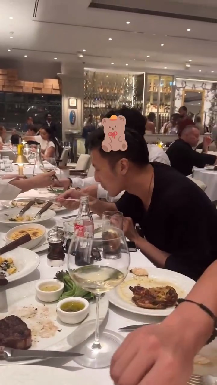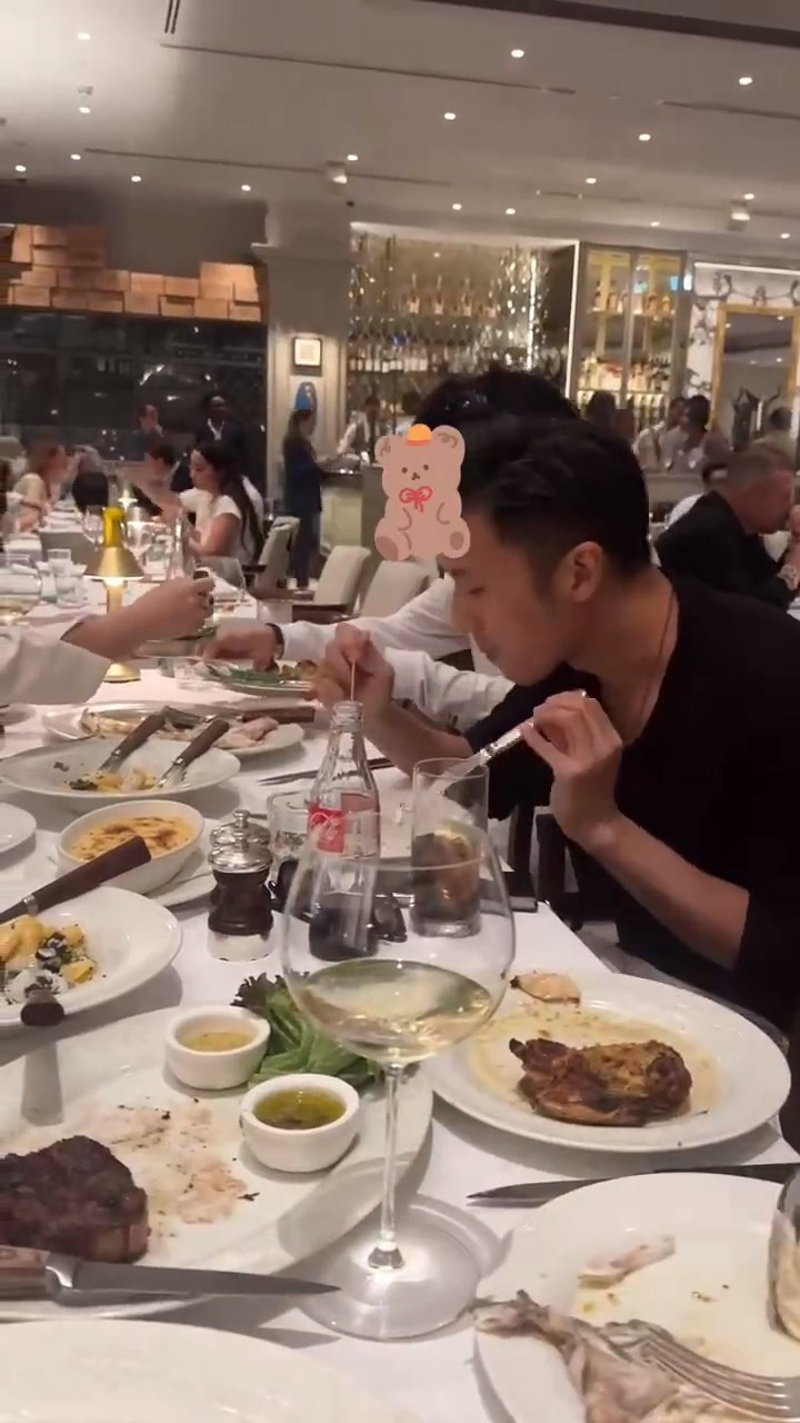 有趣的是,Lucas的对面坐着一个戴着宝石戒指的女人,小心翼翼的把自己的菜分给Lucas,应该是谢霆锋的妈妈狄波拉,所以是祖孙三代一起过生日吗?