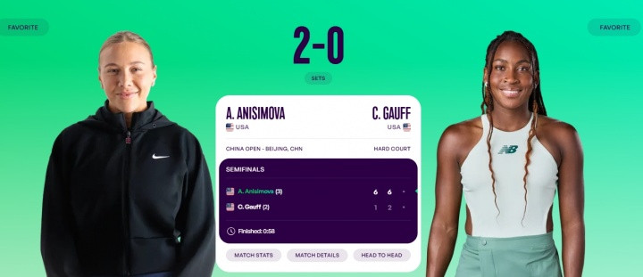 首盘比赛阿尼西莫娃开场连下五局,6-1先声夺人。第二盘,高芙在0-5落后的情况下连破带保,将比分追至2-5。不过阿尼西莫娃很快拿下发球胜赛局,6-2结束比赛。