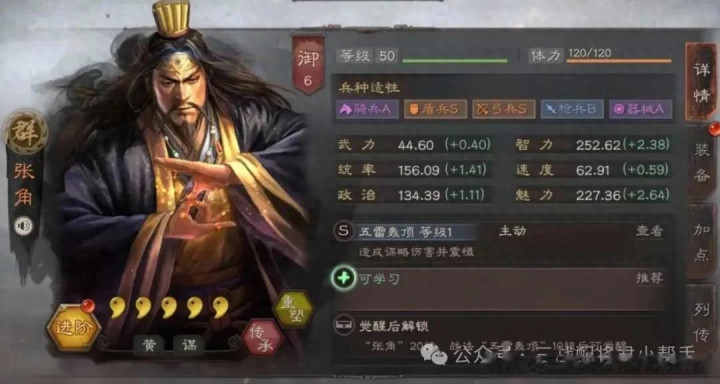 张角(全智):太平道法+士别三日,携带:以治击乱+鬼谋+将威