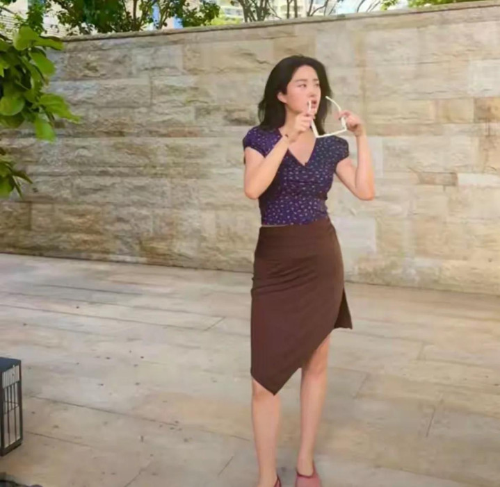 下半身穿了一条咖色的不规则短裙,裙子也是紧身的,把她的大腿和臀部紧紧的包裹着,小腹也是平坦的,没有赘肉和小肚子,这身穿搭显得她的身材纤细又性感。